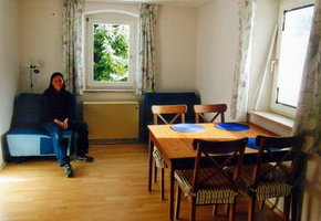 Im abgetrennten großzügigen Wohnbereich befindet sich eine schöne Sitzgruppe, s. Foto. In der Schublade des Tisches finden Sie Prospekte, Veranstaltungshinweise, Adressen für Restaurants, Museen usw. Außerdem: Schrank, Kommode, Lese-Stehlampe, Fernsehgerät, Stereoanlage. Der Holz-Kohle-Kaminofen sorgt, wenn Sie es wünschen, für eine gemütliche Athmosphäre.