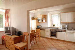 Die Küche ist komplett eingerichtet mit Geschirr für 12 Personen, genügend Töpfen u. m. Kühlschrank und Tiefkühlschrank, Mikrowelle, Kaffeemaschine, Wasserkocher, Toaster, Ceran-Kochfeld mit vier Kochstellen und Backofen. Geschirrspülmaschine. Die Küche ist zum Wohnzimmer hin großzügig offen. Ein schöner Essplatz mit Bank und Stühlen laden zum Genießen ein.
