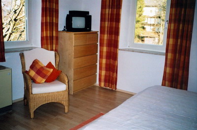 Schlafzimmer: Doppelbett mit Konsolen, Schrank, 2 Stühle. Vom Schlafzimmr aus haben Sie einen wunderschönen Blick nach Bischofsgrün. Safe.