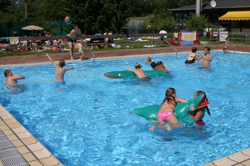 Das Bad hat ein großes Schwimmbecken, ein Nichtschwimmerbecken, ein Sprungbecken mit 1 m, 3 m und 5 m Turm und für unsere kleinen Gäste ein Planschbecken. Auf der großen Liegewiese ist ein Beachvolleyballfeld.